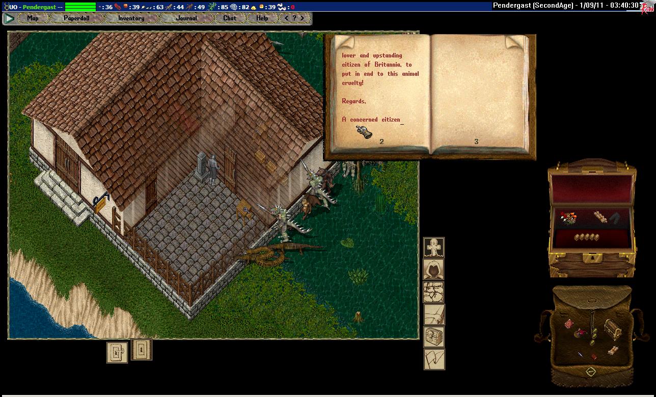 After resting my sore body from a failed attempt to obtain goods just minutes previous to stepping through these fine individual's moongate (notice my low hp), I realized that I was extremely hungry, as you can clearly see. I tried, but could not resist the temptation of such wonderful vegetables, so I indulged. I know, I'm bad.